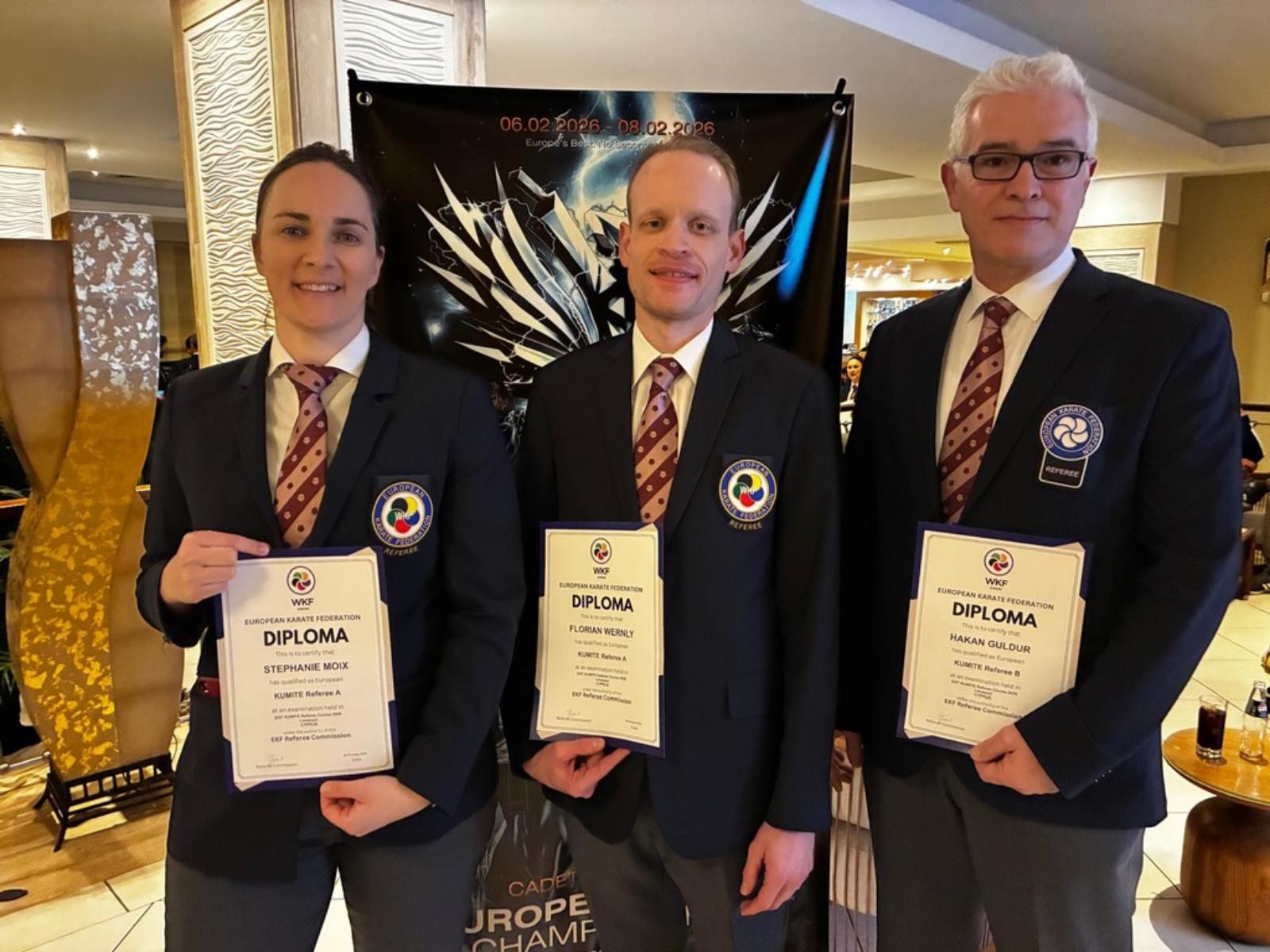 Vor Beginn der EM bestanden Stéphanie Moix und Florian Wernly die Referee A Prüfung, Hakan Güldür die Referee B Prüfung. Mit der höchsten EKF-Schiedsrichterlizenz nehmen Stéphanie Moix und Florian Wernly Einsitz in der Nationalen Schiedsrichterkommission.