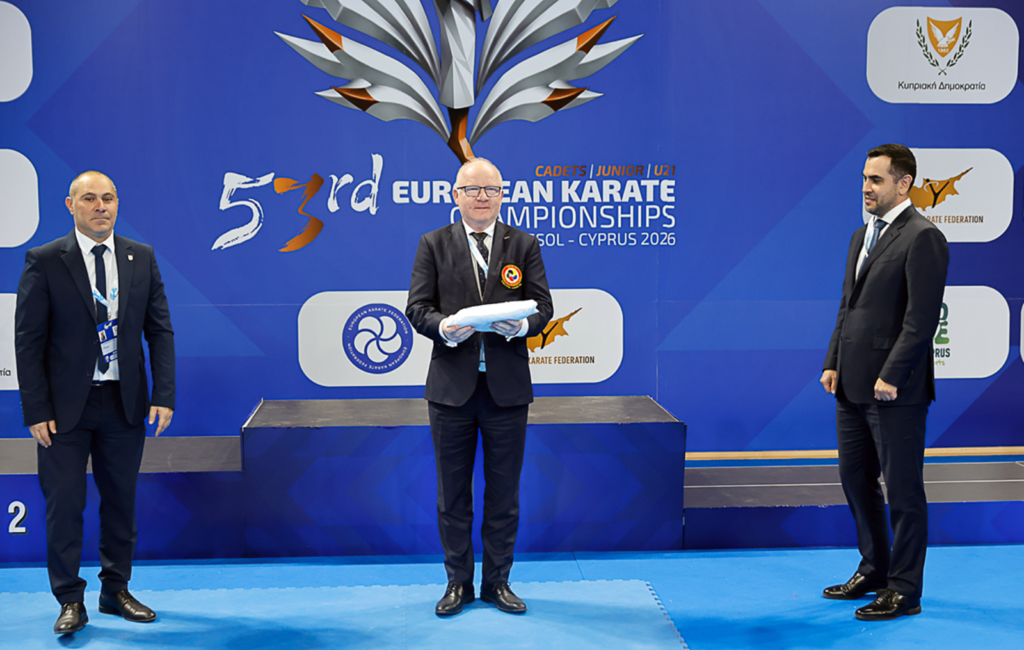 The EKF Vice President Jiri Bocek received the EKF flag from the president of the Cyprus Karate Federation Fotis Marathovouniotis (left) and hand it over the host of the next year’s event, the president of the Armenia Karate Federation Vazgen Harutyunyan.